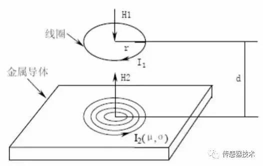 如果在磁場H1的范圍沒有金屬導體接近,則發(fā)射到這一范圍內(nèi)的能量都會被釋放;反之,如果有金屬導體接近探頭頭部,則交變磁場H1將在導體的表面產(chǎn)生電渦流場,該電渦流場也會產(chǎn)生一個方向與H1相反的交變磁場H2。